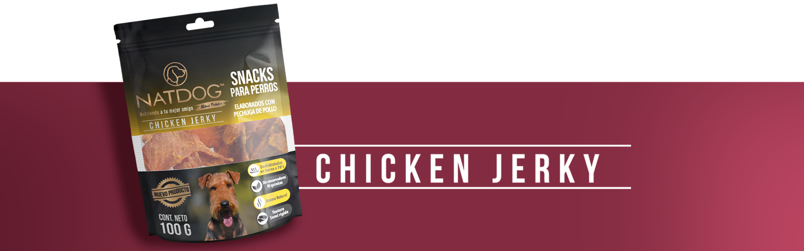 Snack para perros NATDOG: Elaborados con proteína natural, Chicken Jerky (pechuga de pollo) horneada y deshidratada a 75ºC, garantizando los sabores y aromas para darle una gran experiencia a tu mejor amigo.