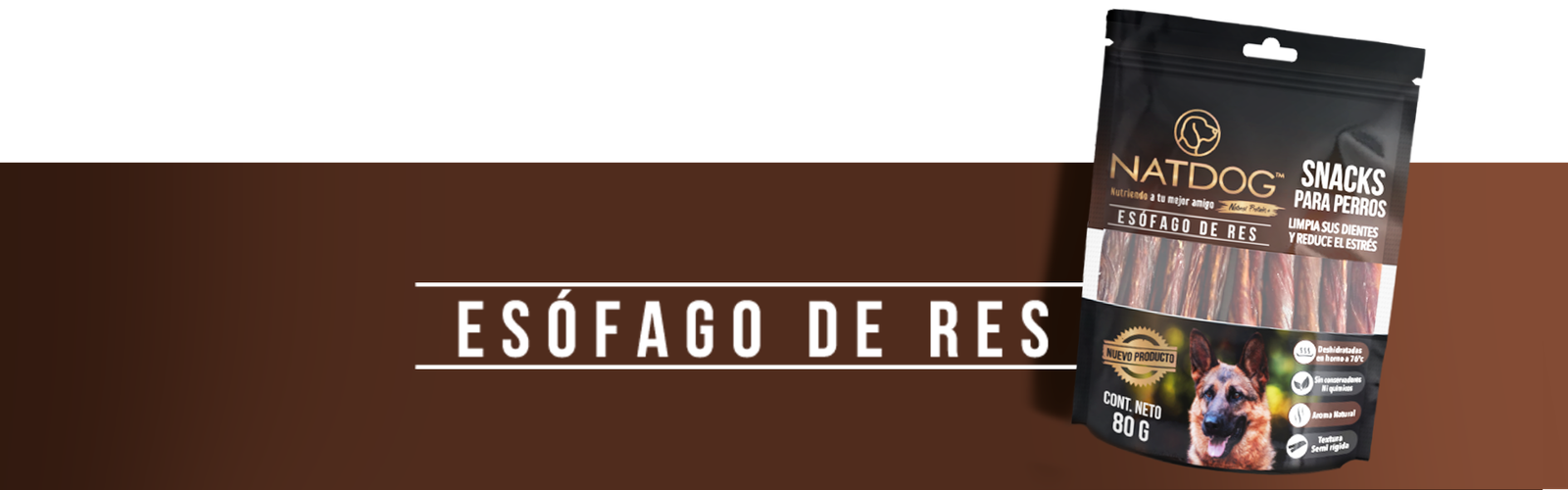Snack para perros NATDOG: Elaborados con proteína natural, esófago de res horneado y deshidratado a 75ºC, garantizando los sabores y aromas para darle una gran experiencia a tu mejor amigo.
